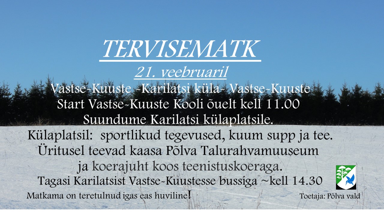 TERVISEMATK Kõik üritused See üritus on möödunud. TERVISEMATK 21. veebruar 2019 @ 11:00 - 14:30 Event Navigation « Karilatsi Küla Seltsi üritus TEATRIÕHTU » KirjeldusKuupäev:21. veebruar 2019Aeg:11:00 - 14:30