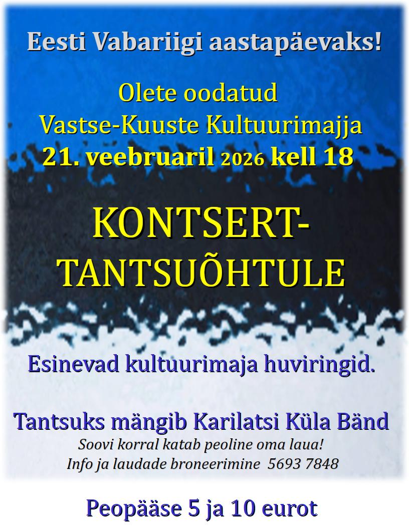 Eesti Vabariigi aastapäevaks! Kõik üritused Eesti Vabariigi aastapäevaks! veebruar 21 @ 18:00 - 23:00 | 5 ja 10 eurot Event Navigation « Hõissa, meil on vastlad! Kokkamine Kõivokõstega" » KirjeldusKuupäev:21. veebruar 2026Aeg:18:00 - 23:00Pilet:5 ja 10 eurot