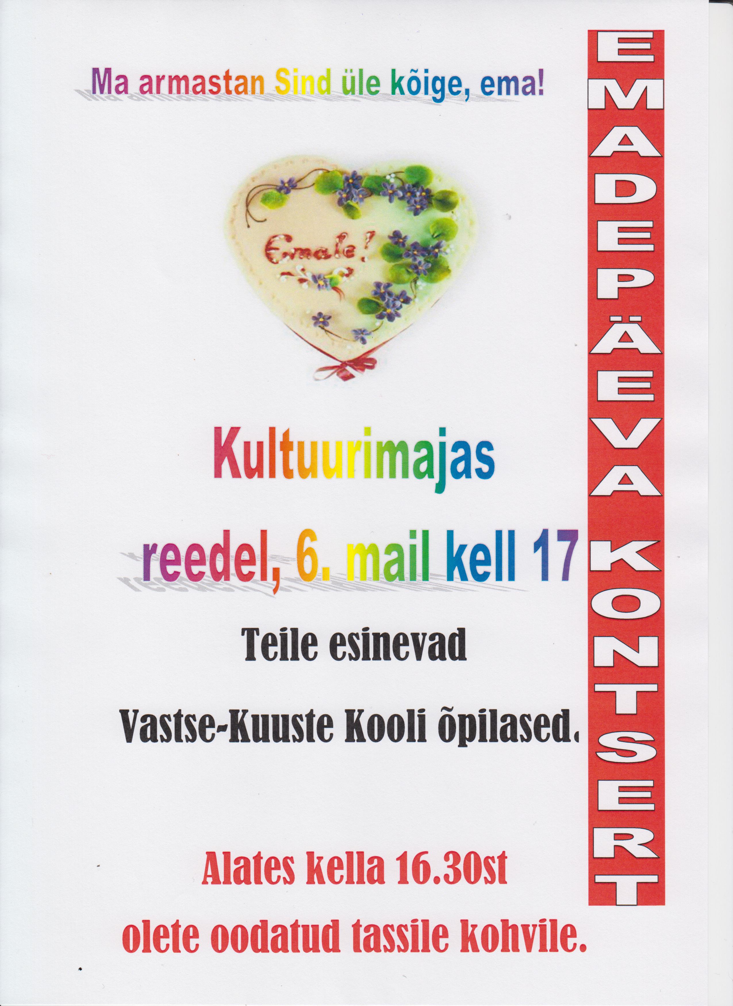 Emadepäeva kontsert Kõik üritused See üritus on möödunud. Emadepäeva kontsert 6. mai 2016 @ 16:30 - 18:00 | Tasuta Event Navigation « KÄSITÖÖTUBA TEATER » KirjeldusKuupäev:6. mai 2016Aeg:16:30 - 18:00Pilet:Tasuta