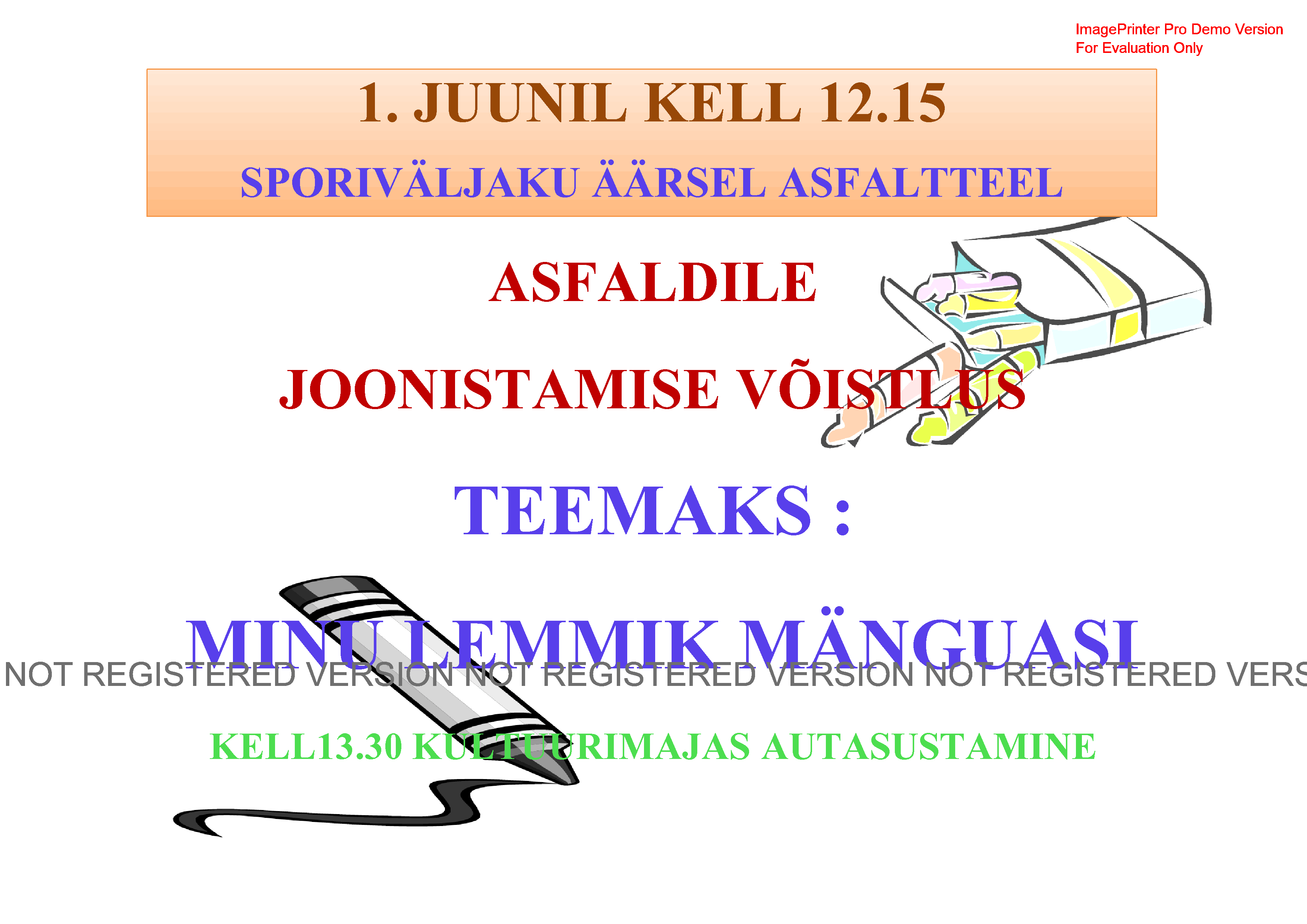 Joonistame asfaldile! Kõik üritused See üritus on möödunud. Joonistame asfaldile! 1. juuni 2017 @ 12:15 - 12:30 Event Navigation « Maakonna folkloorirühmade pidu. Laula, laula suukene... Eakate õppeekskursioon » KirjeldusKuupäev:1. juuni 2017Aeg:12:15 - 12:30
