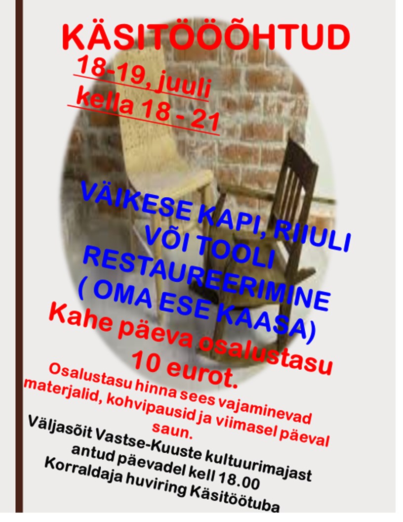 KÄSITÖÖÕHTU Kõik üritused See üritus on möödunud. KÄSITÖÖÕHTU 18. juuli 2018 @ 18:00 - 21:00 | 10 eurot Event Navigation « Eakate õppeekskursioon Sinimägedele KÄSITÖÖÕHTU » KirjeldusKuupäev:18. juuli 2018Aeg:18:00 - 21:00Pilet:10 eurot