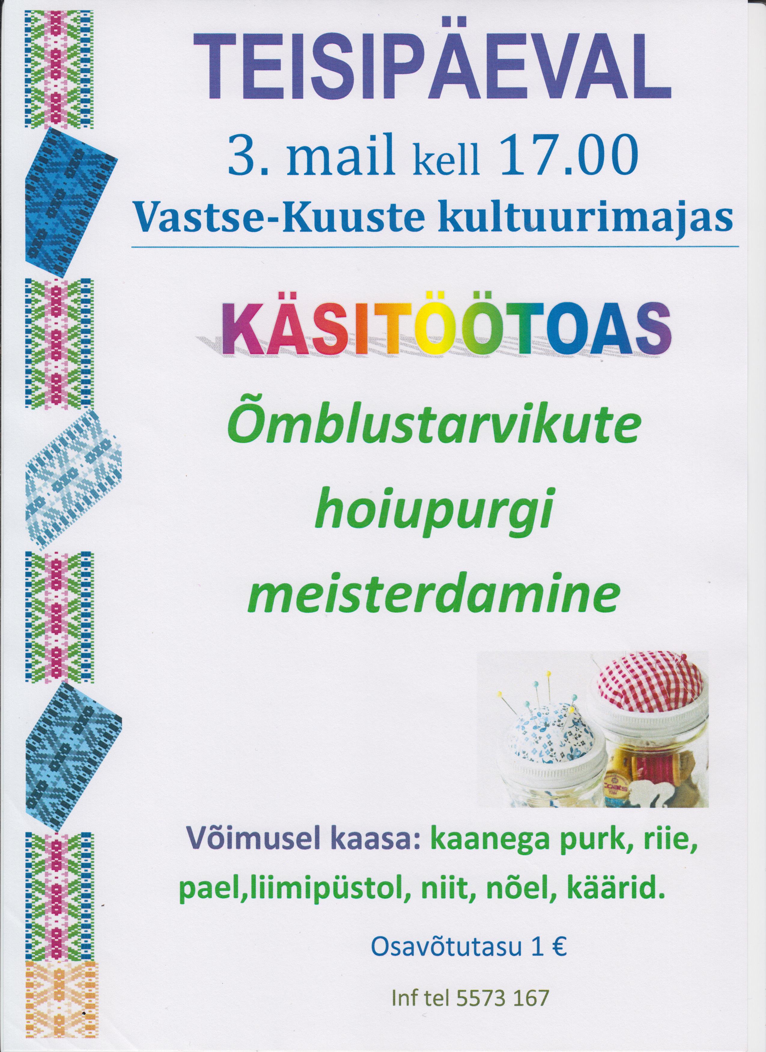 KÄSITÖÖTUBA Kõik üritused See üritus on möödunud. KÄSITÖÖTUBA 3. mai 2016 @ 17:00 - 18:30 | 1€ Event Navigation « KONTSERT Emadepäeva kontsert » KirjeldusKuupäev:3. mai 2016Aeg:17:00 - 18:30Pilet:1€