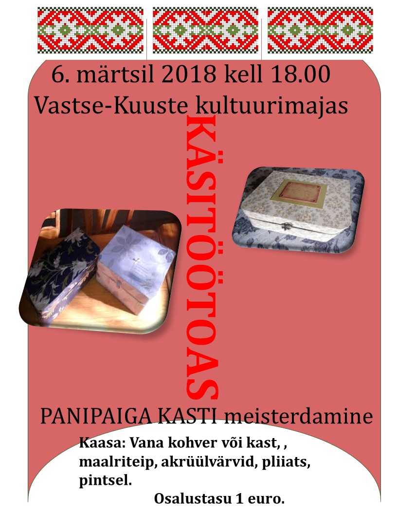 Käsitöötuba Kõik üritused See üritus on möödunud. Käsitöötuba 6. märts 2018 @ 18:00 - 19:30 | 1 euro Event Navigation « Lastele kino Naistepäeva pidu » KirjeldusKuupäev:6. märts 2018Aeg:18:00 - 19:30Pilet:1 euro