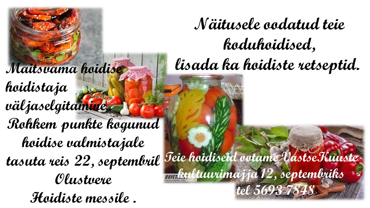 Koduhoidiste näitus – degustatsioon Kõik üritused See üritus on möödunud. Koduhoidiste näitus – degustatsioon 13. september 2018 @ 00:00 - 14. september 2018 @ 00:00 Event Navigation « KINOÕHTU Kino lastele » Hoidiste kultuurimajja toomise 10, 11, 12 .septembril palume leppida kokku telefonil 5693 7848 KirjeldusStart:13. september 2018 00:00End:14. september 2018 00:00