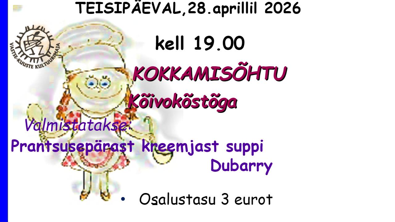 Kokkamine Kõivokõstega Kõik üritused Kokkamine Kõivokõstega aprill 28 @ 19:00 - 21:00 | €3 Event Navigation « Koristustalgud! HeaMaigu teatrietendus. Karupoeg Puhhi ja tema sõprade seiklused » KirjeldusKuupäev:28. aprill 2026Aeg:19:00 - 21:00Pilet:€3