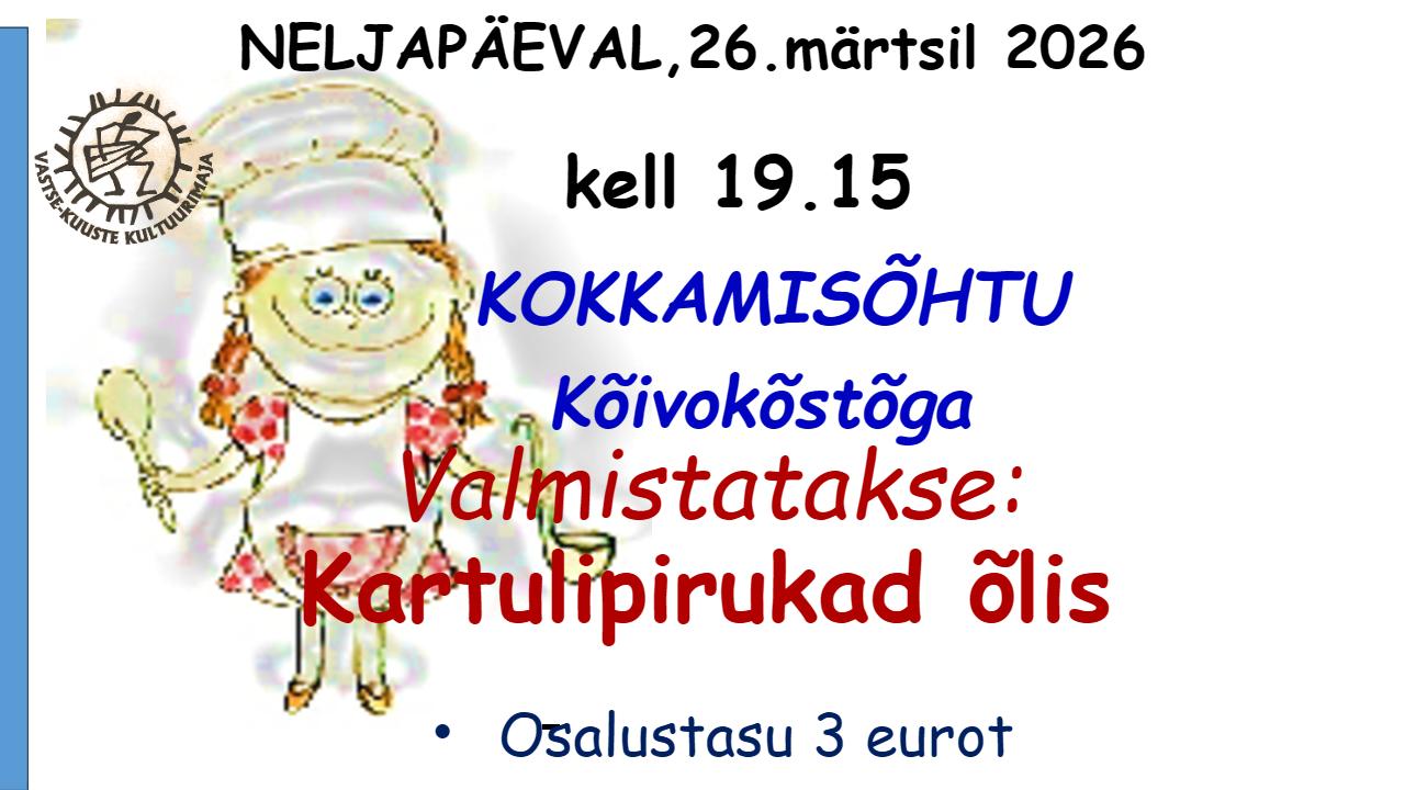 Kokkamine Kõivokõstõga. Kõik üritused Kokkamine Kõivokõstõga. märts 26 @ 08:00 - 17:00 | 3€ Event Navigation « Rahvakalendri tähtpäev! Kinoõhtu. Film "Säärane mulk" » KirjeldusKuupäev:26. märts 2026Aeg:08:00 - 17:00Pilet:3€