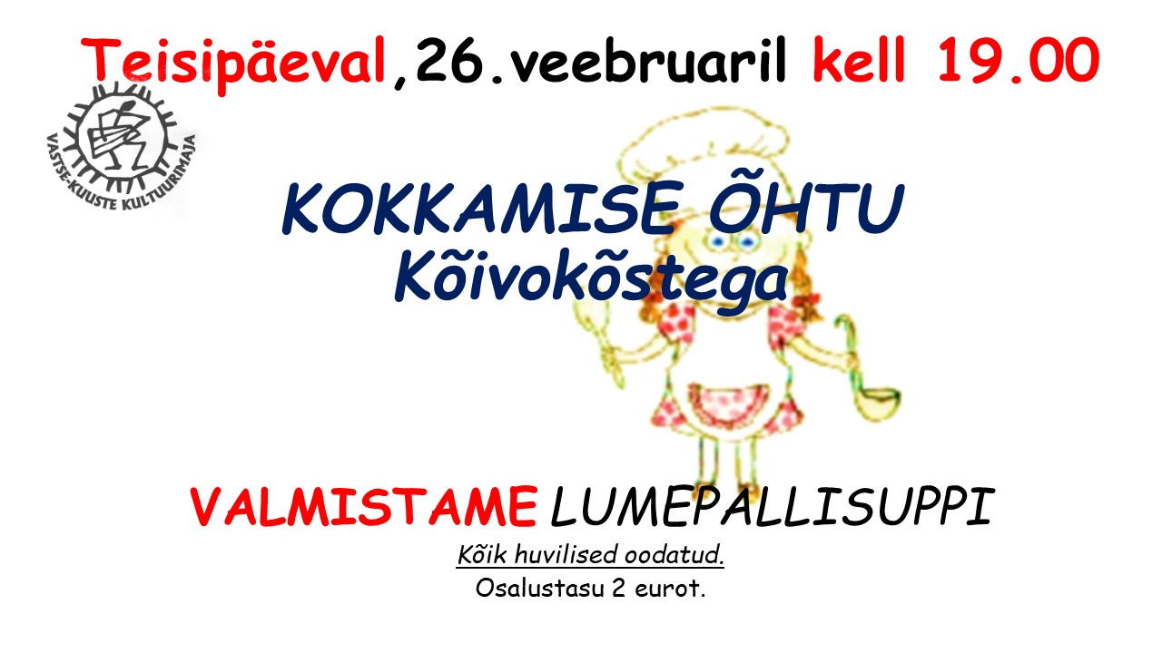 KOKKAMISÕHTU KÕIVOKÕSTEGA Kõik üritused See üritus on möödunud. KOKKAMISÕHTU KÕIVOKÕSTEGA 26. veebruar 2019 @ 19:00 - 20:30 | 2 eurot Event Navigation « TEATRIÕHTU KINO » KirjeldusKuupäev:26. veebruar 2019Aeg:19:00 - 20:30Pilet:2 eurot
