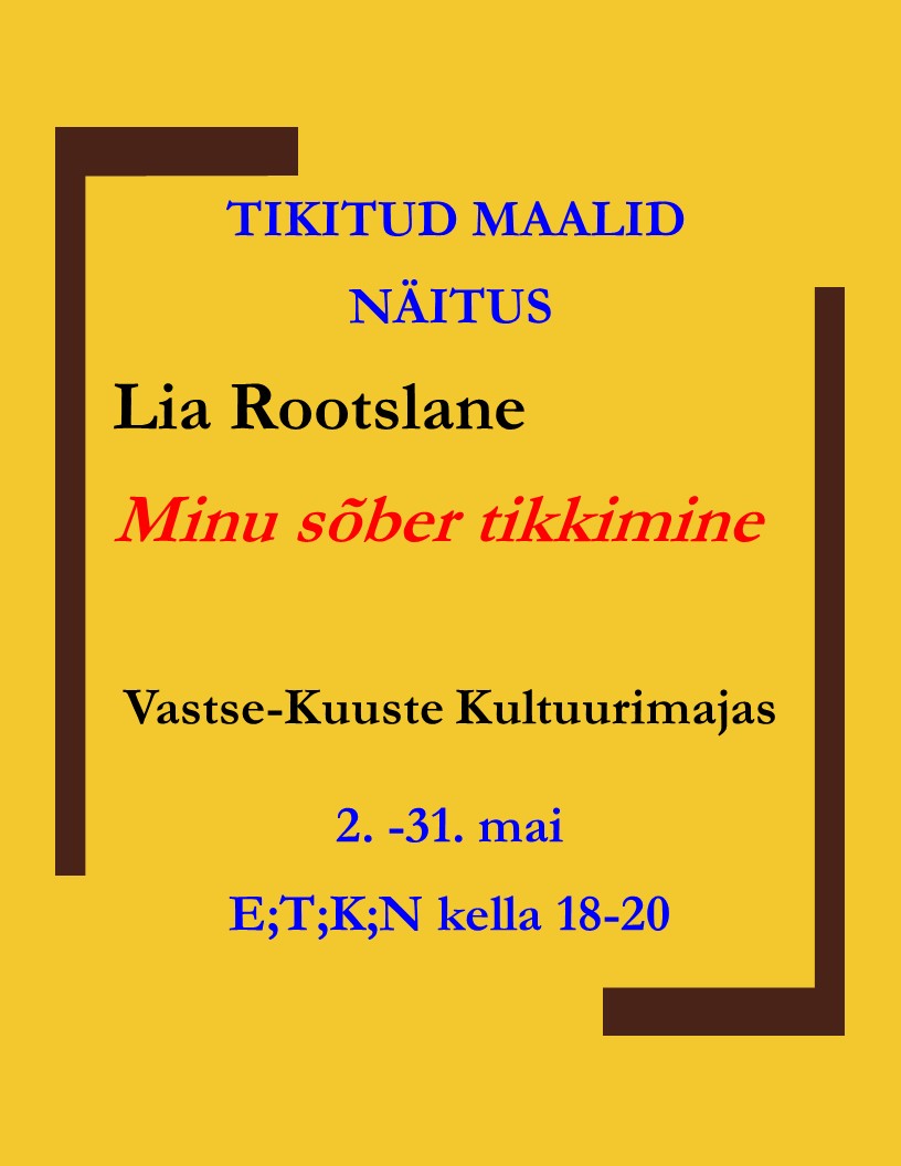 TIKITUD MAALIDE NÄITUS Kõik üritused See üritus on möödunud. TIKITUD MAALIDE NÄITUS 2. mai 2018 @ 00:00 - 31. mai 2018 @ 00:00 Event Navigation « Kokkamisõhtu Kõivokõstega Vastse-Kuuste näitering Vilustes » KirjeldusStart:2. mai 2018 00:00End:31. mai 2018 00:00
